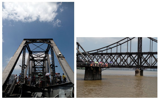 Δ(圖左)丹東鴨綠江「斷橋」斷口處。(圖右)前為丹東鴨綠江「斷橋」,為韓戰時美軍炸斷,後為中朝友誼橋。